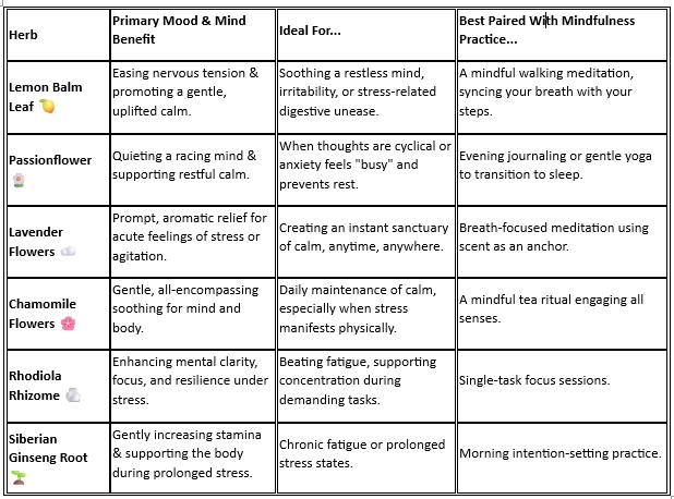 This table provides a quick guide to these mindfulness herbs, helping you choose the right support for your moment, whether youโ€™re seeking calm, focus, or gentle resilience. It highlights each herbโ€™s primary mood benefit, ideal use cases, and how to pair it with simple mindfulness practices, making it easier to integrate these herbs into your daily routine.